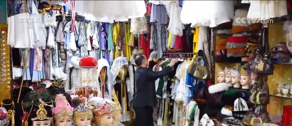 在總臺(tái)2024年春晚舞臺(tái)上,演員們身穿特色服飾進(jìn)行表演,驚艷全場(chǎng)。春晚過(guò)后,慕名前來(lái)購(gòu)買和定制艾特萊斯服飾的游客不斷增加。努爾·買買提原本在當(dāng)?shù)亟?jīng)營(yíng)一家數(shù)碼產(chǎn)品店鋪,看到旅拍店艾特萊斯服飾等傳統(tǒng)民族服裝的租賃和定制需求增加,他便在喀什古城開(kāi)了一家民族服裝綜合店。