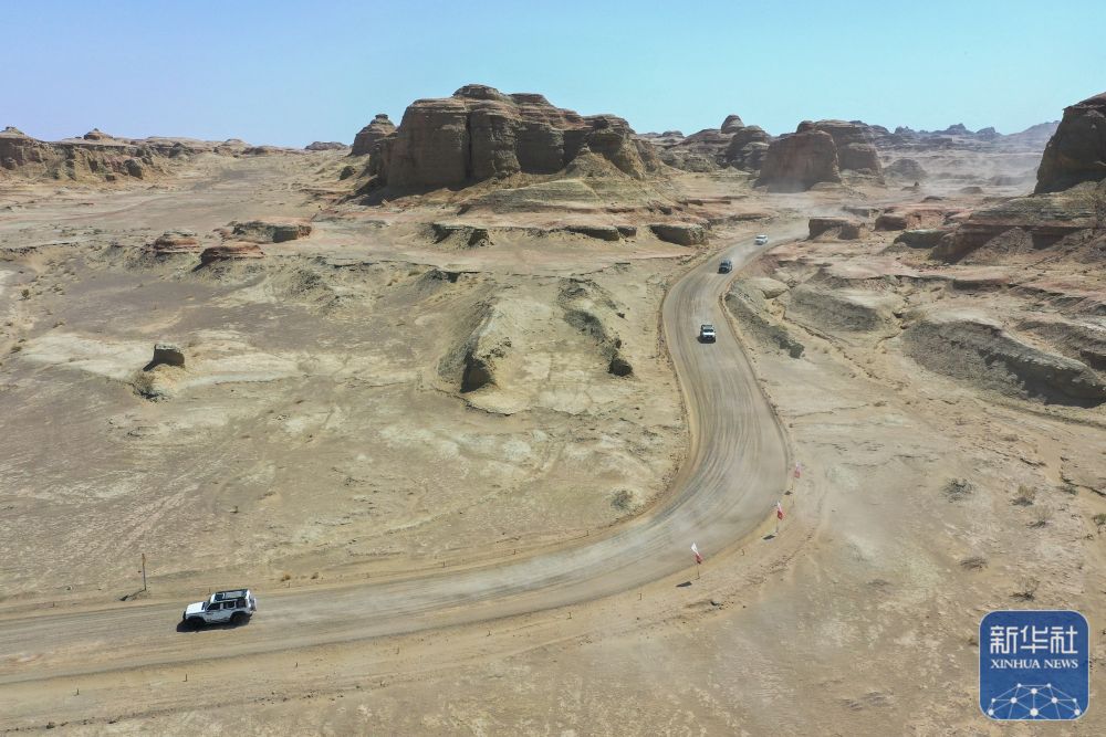 在新疆克拉瑪依市烏爾禾區(qū)世界魔鬼城景區(qū),車(chē)友在自駕線(xiàn)路上疾馳(5月1日攝,無(wú)人機(jī)照片)。