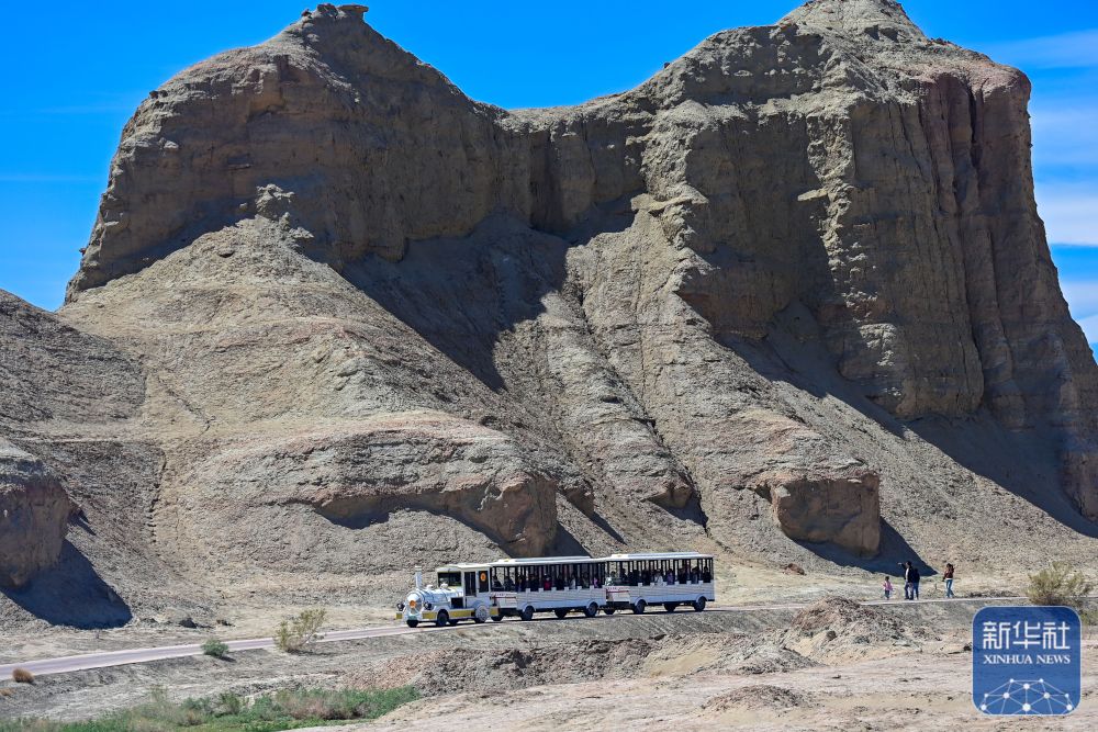 在新疆克拉瑪依市烏爾禾區(qū)世界魔鬼城景區(qū),游客乘坐觀光車(chē)游覽(5月2日攝)。