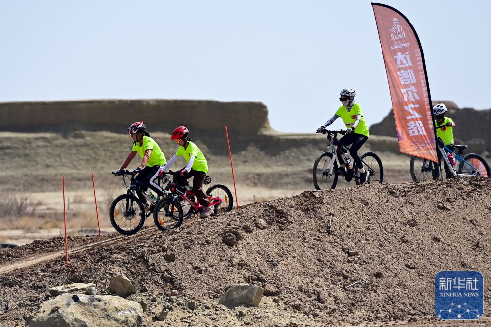 在新疆克拉瑪依市烏爾禾區(qū)世界魔鬼城景區(qū),小朋友們?cè)谧择{線(xiàn)路上體驗(yàn)自行車(chē)越野(5月1日攝)。