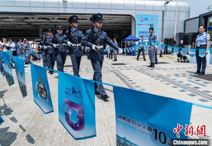 4月13日,香港特區(qū)政府保安局下轄的各紀(jì)律部隊(duì)舉行“全民國家安全教育日”開放日活動。圖為香港航空青年團(tuán)成員在政府飛行服務(wù)隊(duì)開放日活動上展示中式步操。(資料圖片) 中新社記者 侯宇 攝