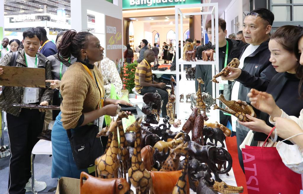 2023年11月6日,來自津巴布韋的艾薇頓絲·察卡瓦在展臺向參觀者介紹木雕展品。這是她第一次來到中國上海參加進(jìn)博會,這些木雕都是她的哥哥在家里制作的,她想通過進(jìn)博會為哥哥的木雕作品找到好的銷路。新華社記者方喆攝