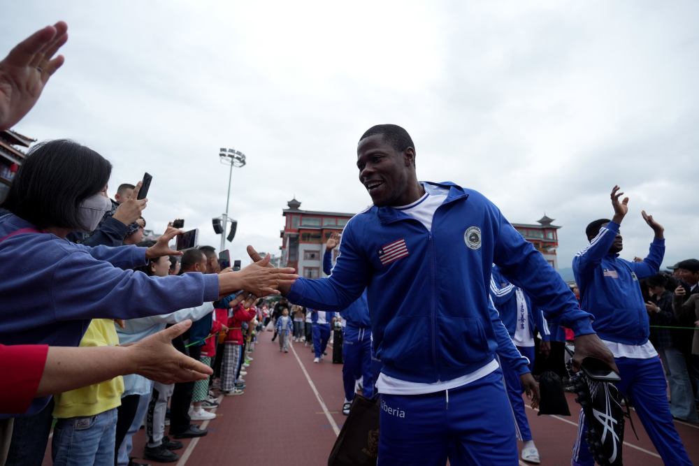 5月1日,貴州省黔東南苗族侗族自治州榕江縣“村超”球場,來自非洲利比里亞社聯(lián)足球隊球員與群眾互動。新華社發(fā)(王炳真 攝)