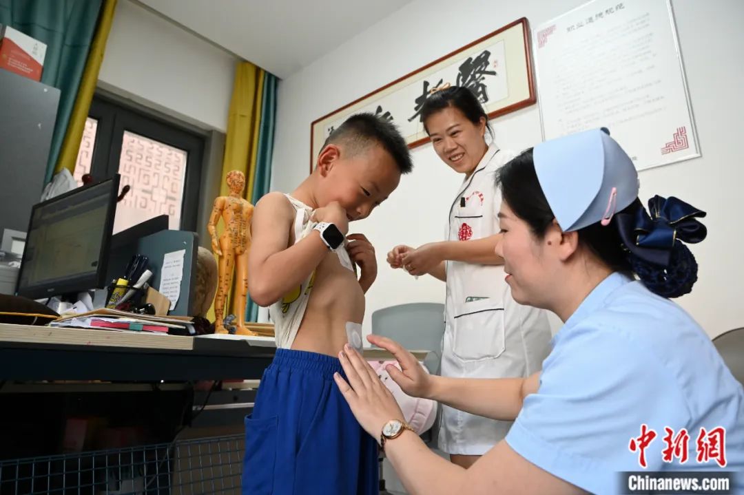 2023年7月11日,入伏首日,在內蒙古呼和浩特市一醫(yī)院內,醫(yī)護人員為小朋友貼“三伏貼”。“三伏貼”是一種傳統(tǒng)的冬病夏治療法。劉文華 攝