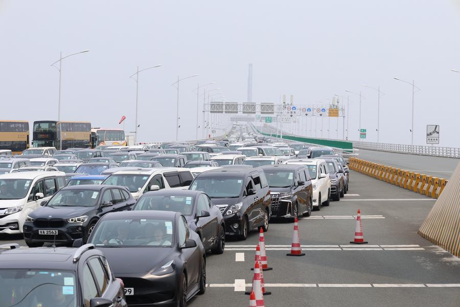 2024年3月9日拍攝的港珠澳大橋橋頭等待北上的車輛。港珠澳大橋邊檢站的數(shù)據(jù)顯示,截至3月9日21時,經(jīng)該站查驗(yàn)的出入境“港車北上”車輛已突破50萬輛次。邊檢部門介紹,自2023年7月1日“港車北上”政策正式實(shí)施以來,駕駛單牌私家車“北上”的香港居民數(shù)量持續(xù)上升。 新華社發(fā)(王相國攝)