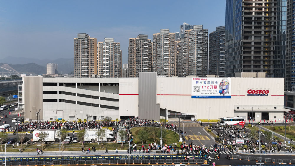 1月12日,開(kāi)市客深圳店外排起長(zhǎng)龍(無(wú)人機(jī)照片)。新華社記者 梁旭 攝