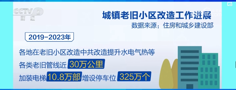 數(shù)據(jù)顯示,2019年—2023年,全國累計開工改造老舊小區(qū)22萬個,惠及居民3800多萬戶、近1億人。各地在老舊小區(qū)改造中,共改造提升水電氣熱等各類老舊管線近30萬公里,加裝電梯10.8萬部,增設(shè)停車位325萬個、電動汽車充電樁10.4萬個、電動自行車充電樁68萬個,增設(shè)養(yǎng)老托育等各類社區(qū)服務(wù)設(shè)施6.8萬個。