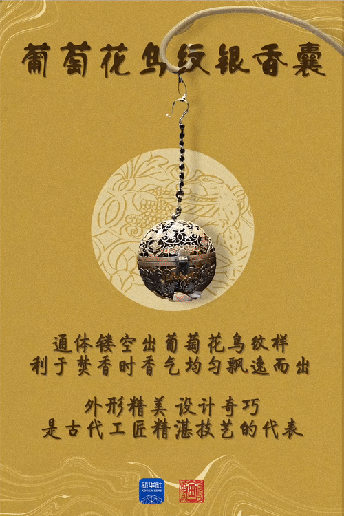 葡萄花鳥紋銀香囊體現(xiàn)了唐代貴族的生活意趣。“唐代社會(huì)的開放包容,人們生活中的儀式感都融入在這枚香囊之中。”陜西歷史博物館副研究館員賀達(dá)炘說(shuō)。