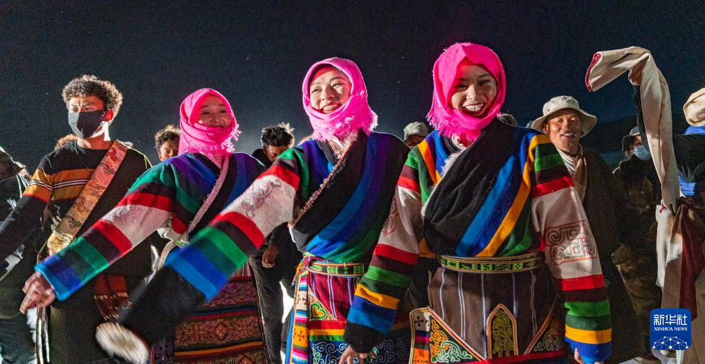 舞蹈演員在納木錯(cuò)開(kāi)湖篝火晚會(huì)現(xiàn)場(chǎng)表演(5月18日攝)。