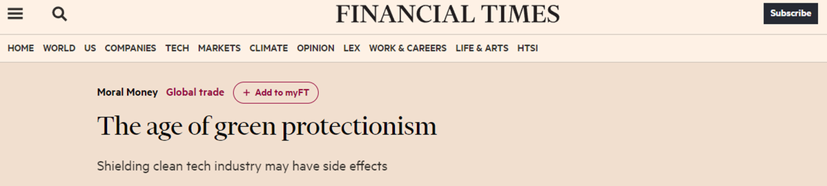 《金融時報》網(wǎng)站17日刊文稱,美國的“綠色”保護(hù)主義措施將不可避免地擾亂貿(mào)易,不利于美國國內(nèi)制造商提高產(chǎn)能。對于應(yīng)對氣候變化而言,此舉或阻礙全球能源綠色轉(zhuǎn)型。