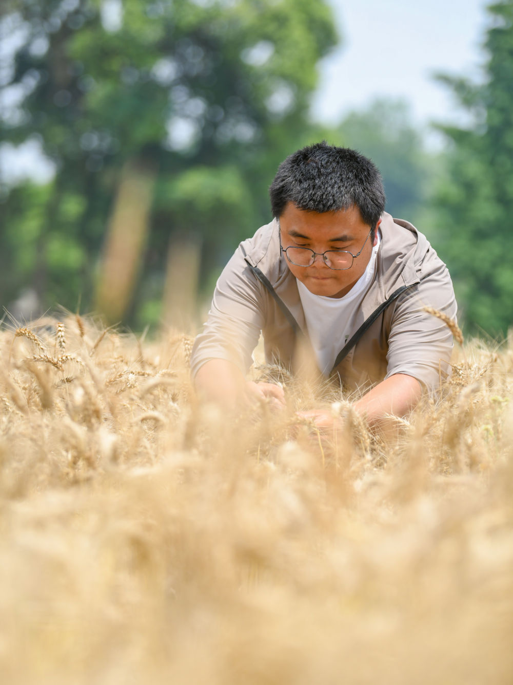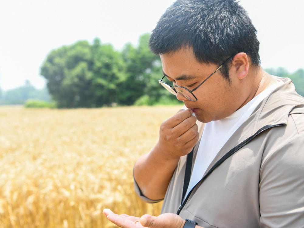 在四川成都崇州市三江街道古泉村,舒星宇在麥田里查看小麥成熟情況(5月15日攝)。