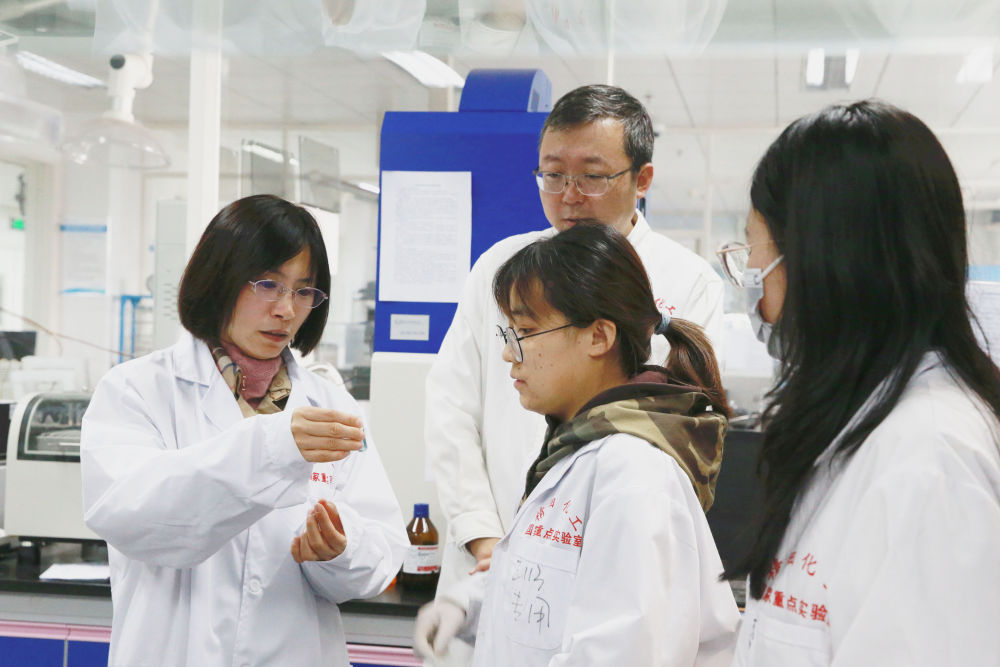 大連理工大學(xué)化工學(xué)院樊江莉(左)教授與同事及學(xué)生查看實驗結(jié)果(2021年11月攝)。新華社發(fā)