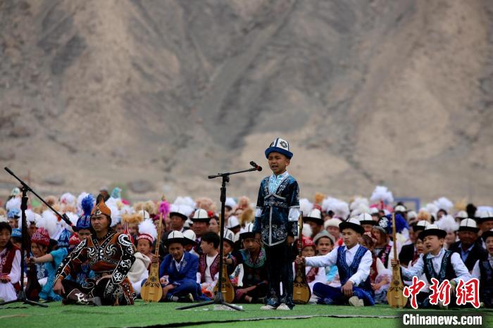 近日,2024年新疆阿合奇縣獵鷹文化旅游季拉開帷幕,現(xiàn)場小瑪納斯奇?zhèn)鞒腥藶橛^眾說唱《瑪納斯》。陶拴科 攝