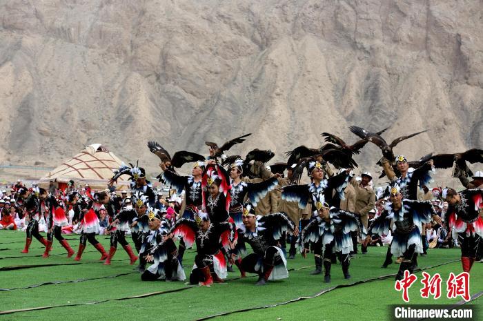 近日,2024年新疆阿合奇縣獵鷹文化旅游季拉開帷幕,活動(dòng)現(xiàn)場獵鷹手與舞蹈演員共同演繹獵鷹舞。陶拴科 攝