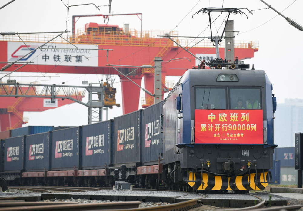 5月25日,X8157次中歐班列從西安國(guó)際港站開出,駛向波蘭馬拉舍維奇。新華社記者張博文攝