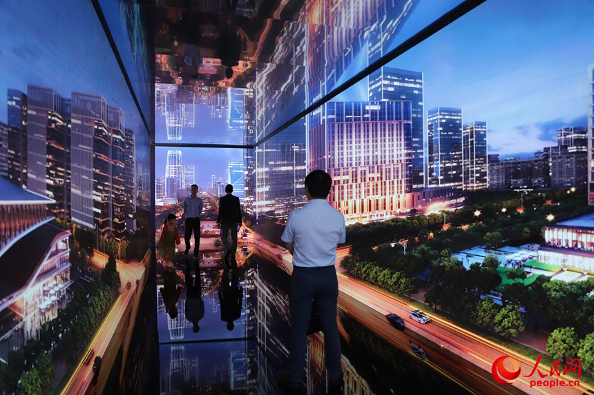河北展區(qū),雄安新區(qū)時空長廊打造出沉浸式、交互式創(chuàng)意體驗空間。人民網(wǎng) 劉森君攝