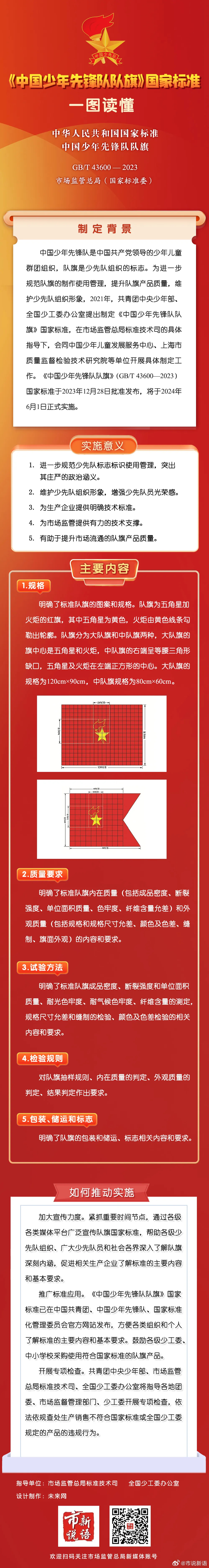 《中國少年先鋒隊(duì)隊(duì)旗》(GB/T 43600—2023)國家標(biāo)準(zhǔn)將于2024年6月1日正式實(shí)施。該標(biāo)準(zhǔn)由市場(chǎng)監(jiān)管總局(國家標(biāo)準(zhǔn)委)批準(zhǔn)發(fā)布,共青團(tuán)中央、全國少工委會(huì)同相關(guān)單位編制。
