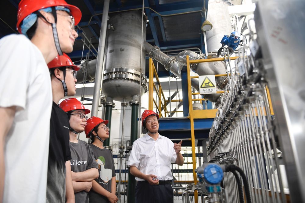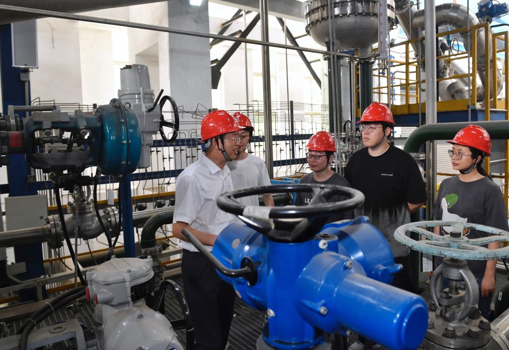 5月24日,在位于成都的中國核動力研究設計院內(nèi),鐘元章(右一)與團隊年輕人在試驗臺架上交流。