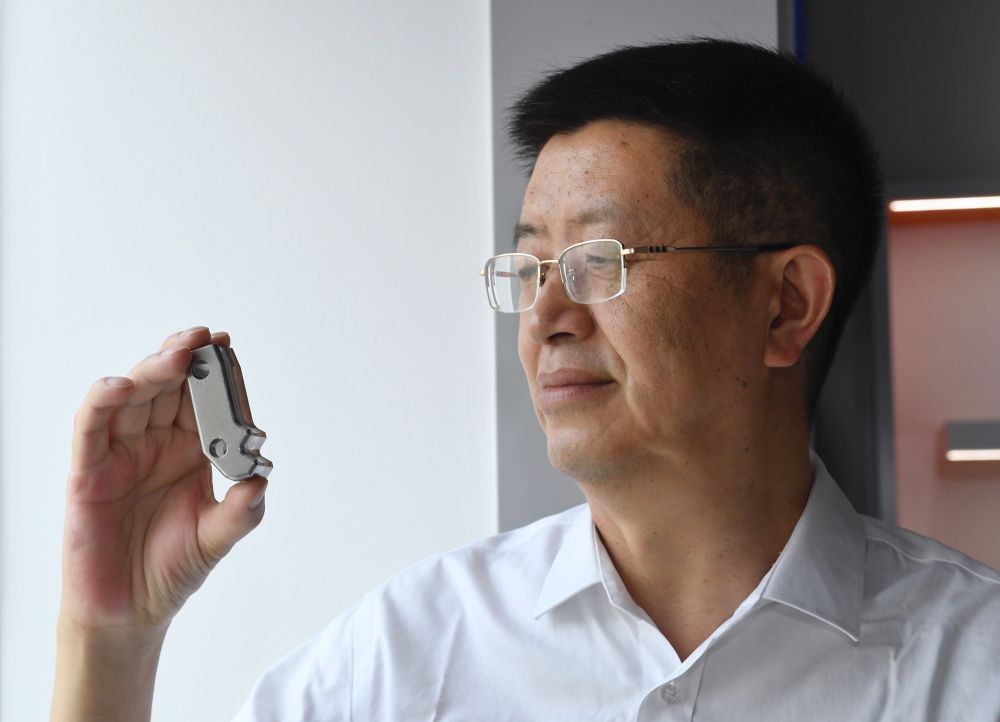 5月24日,在位于成都的中國核動力研究設計院內(nèi),鐘元章在展示通過3D打印的堆內(nèi)構(gòu)件堆芯圍筒。鐘元章介紹,通過3D打印的方式來生產(chǎn)“華龍一號”的零部件,是目前的一個研究方向。