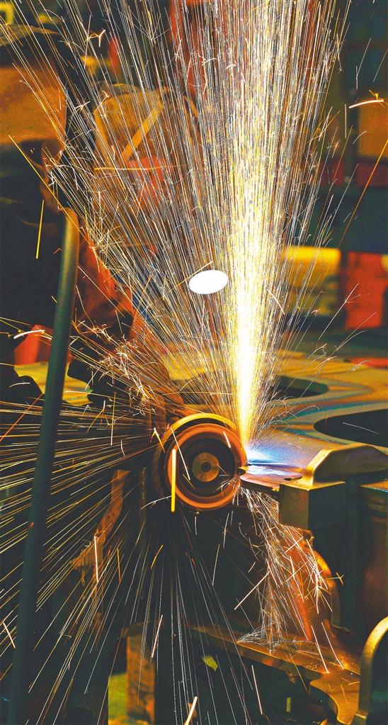 ▼5月28日,中車(chē)長(zhǎng)客轉(zhuǎn)向架事業(yè)部焊接產(chǎn)線(xiàn)組,員工在進(jìn)行動(dòng)車(chē)組構(gòu)架橫梁焊后修磨作業(yè)。