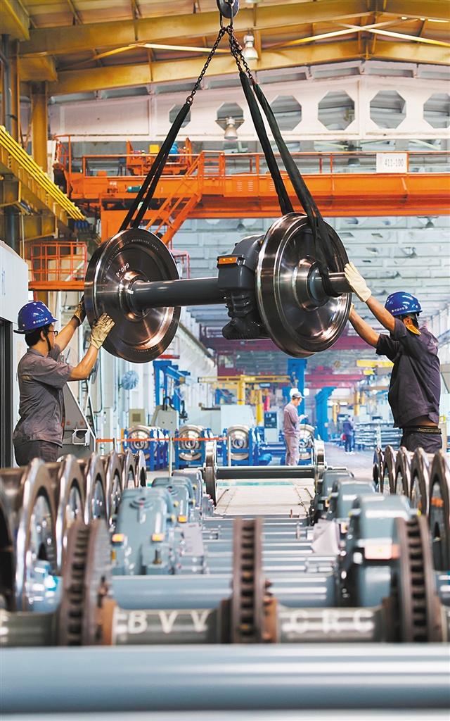 ▼5月28日,中車(chē)長(zhǎng)客轉(zhuǎn)向架事業(yè)部總成產(chǎn)線(xiàn)組,員工在進(jìn)行城軌輪對(duì)壓裝作業(yè)。