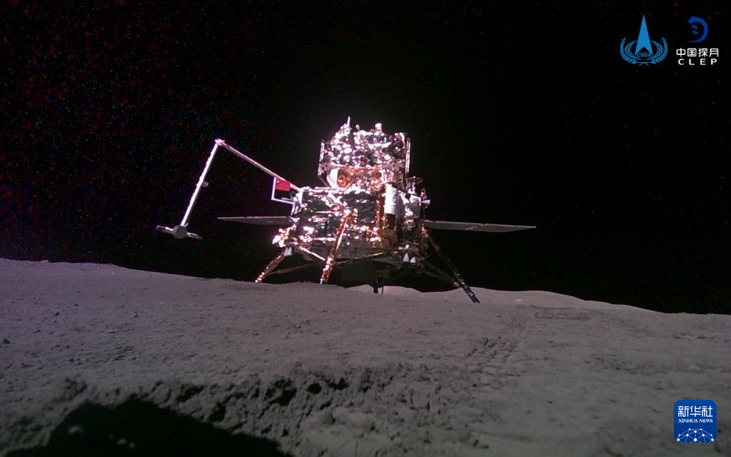 6月3日,嫦娥六號(hào)攜帶的“移動(dòng)相機(jī)”自主移動(dòng)后拍攝并回傳的著陸器和上升器合影。新華社發(fā)(國家航天局供圖)