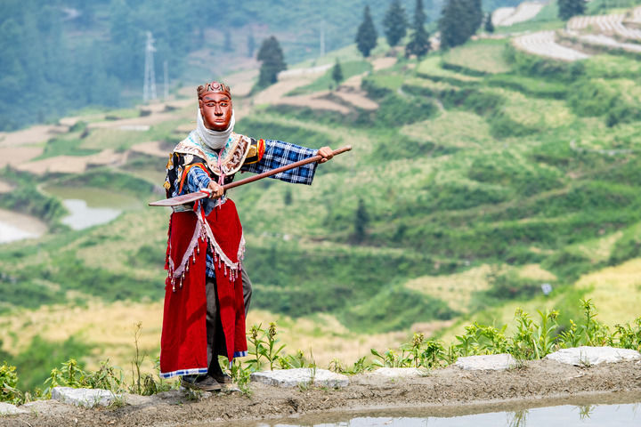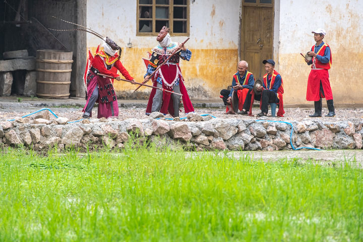 又是一年武陵山間水稻插秧季。在重慶市酉陽土家族苗族自治縣銅鼓鎮(zhèn)清泉村,水稻田間時(shí)時(shí)回響著極具地方特色的戲曲唱段,一群特別的非遺技藝陽戲(酉陽土家面具陽戲)表演者,往來于田間地頭。他們忙時(shí)翻土培秧,準(zhǔn)備著水稻插秧,閑時(shí)則舞槍弄?jiǎng)Γ叛葜硌輨∧俊?/p>