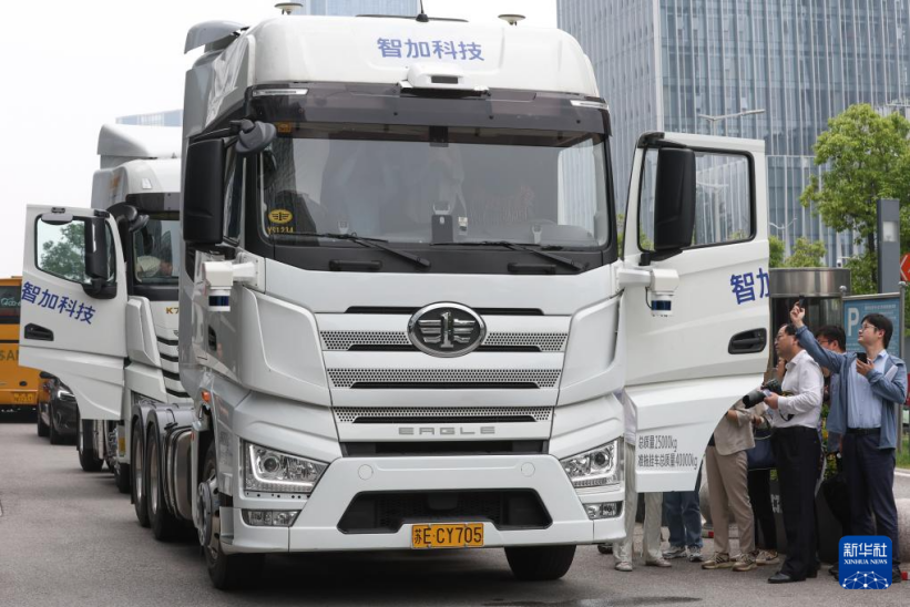 6月1日,人們?cè)趨⒂^兩輛由蘇州智加科技有限公司與車(chē)企共同開(kāi)發(fā)的智能駕駛重型卡車(chē)。新華社記者 楊磊 攝