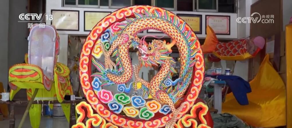 這件精美的龍燈彩扎藝術(shù)品,名叫《飛龍在天》,是由非遺傳承人周合平歷時3個月完成的,馬上就要送往北京,收藏在中國非物質(zhì)文化遺產(chǎn)館。在這間扎龍工作室里,記者看到,大家正在趕制一批表演用的龍燈。