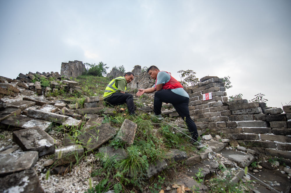 技工楊戰(zhàn)杰(右)在指導(dǎo)工人拉線劃設(shè)北京箭扣長城研究性修繕考古發(fā)掘范圍(2022年8月17日攝)。新華社記者 陳鐘昊 攝