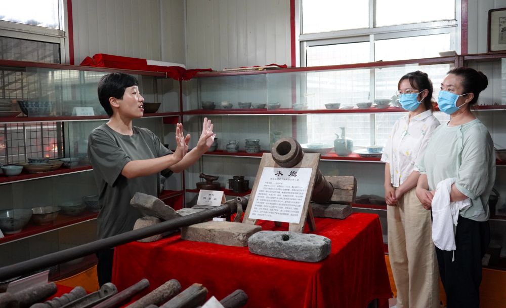 在秦皇島市海港區(qū)的長城文化展館,長城保護(hù)員李翠(左一)向游客介紹長城文化知識(shí)(2021年7月8日攝)。新華社記者 金皓原 攝