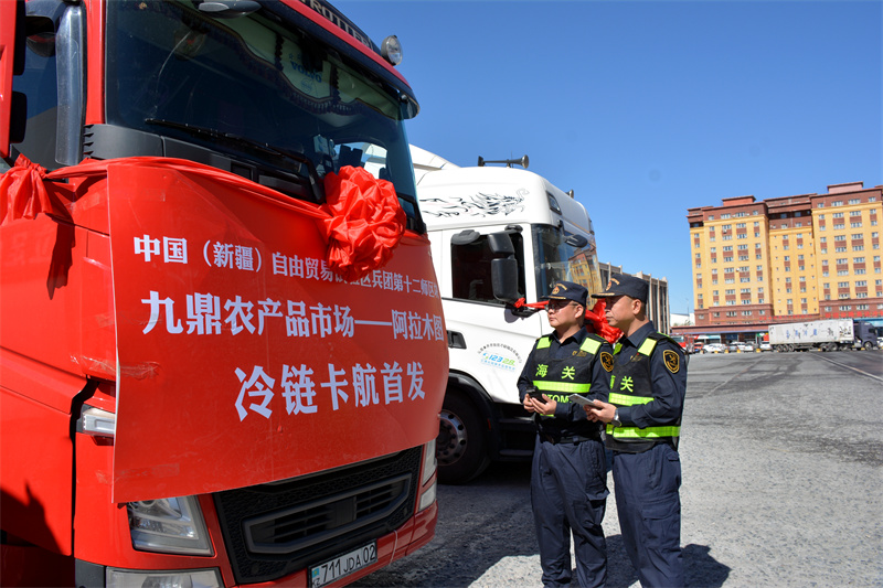 5月10日,一輛滿(mǎn)載蘋(píng)果的冷鏈運(yùn)輸車(chē)從烏魯木齊市發(fā)車(chē)前往哈薩克斯坦阿拉木圖市。這是新疆首次實(shí)現(xiàn)果蔬冷鏈卡航直達(dá)中亞市場(chǎng)。圖為烏昌海關(guān)關(guān)員對(duì)冷鏈卡航模式出口鮮蘋(píng)果進(jìn)行驗(yàn)放。楊逸萌攝