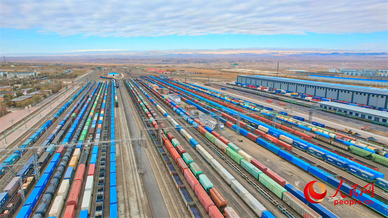 阿拉山口站編組場(chǎng)內(nèi)停靠著待發(fā)的中歐班列及其他出入境貨物列車(chē)。人民網(wǎng) 李欣洋攝