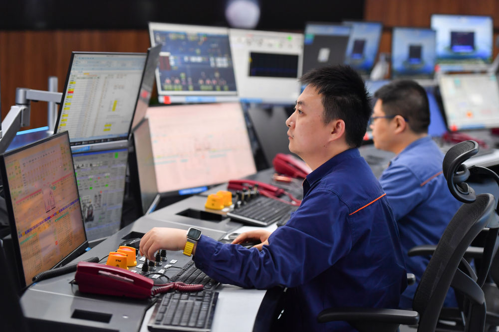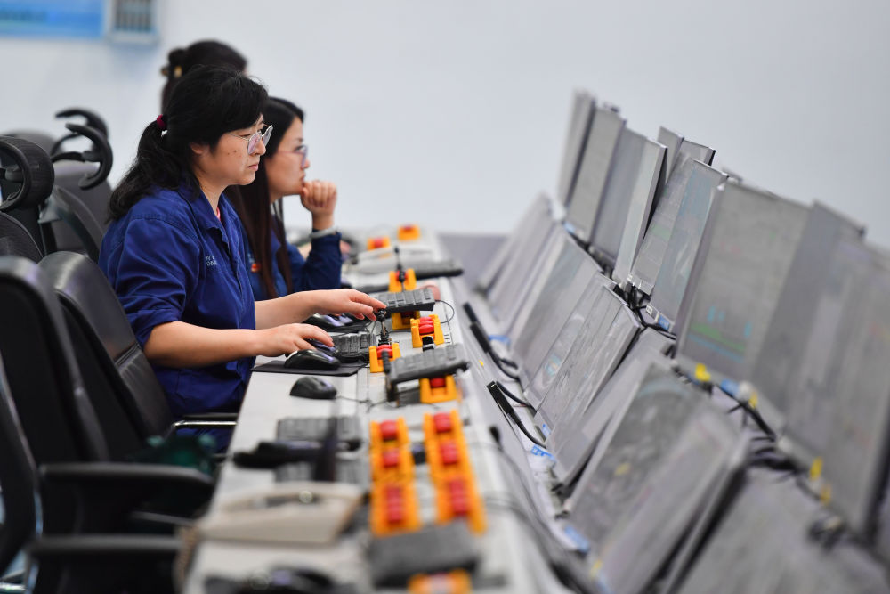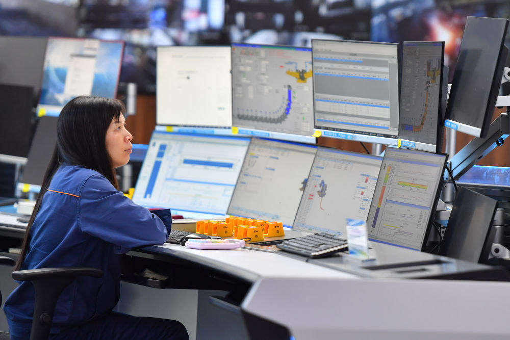 2024年6月13日,在位于湖南省湘潭市的湘潭鋼鐵集團有限公司五米寬厚板廠智慧中心,工作人員在遠程操作加熱爐設備。五米寬厚板廠智慧中心利用超融合、虛擬化、5G傳輸以及分布式計算和存儲等技術,將五米板煉鋼、軋鋼和熱處理全工序的控制和二級、三級系統(tǒng)進行整合,改善工人的工作環(huán)境,提高生產(chǎn)的自動化程度和效率。新華社記者 陳澤國 攝