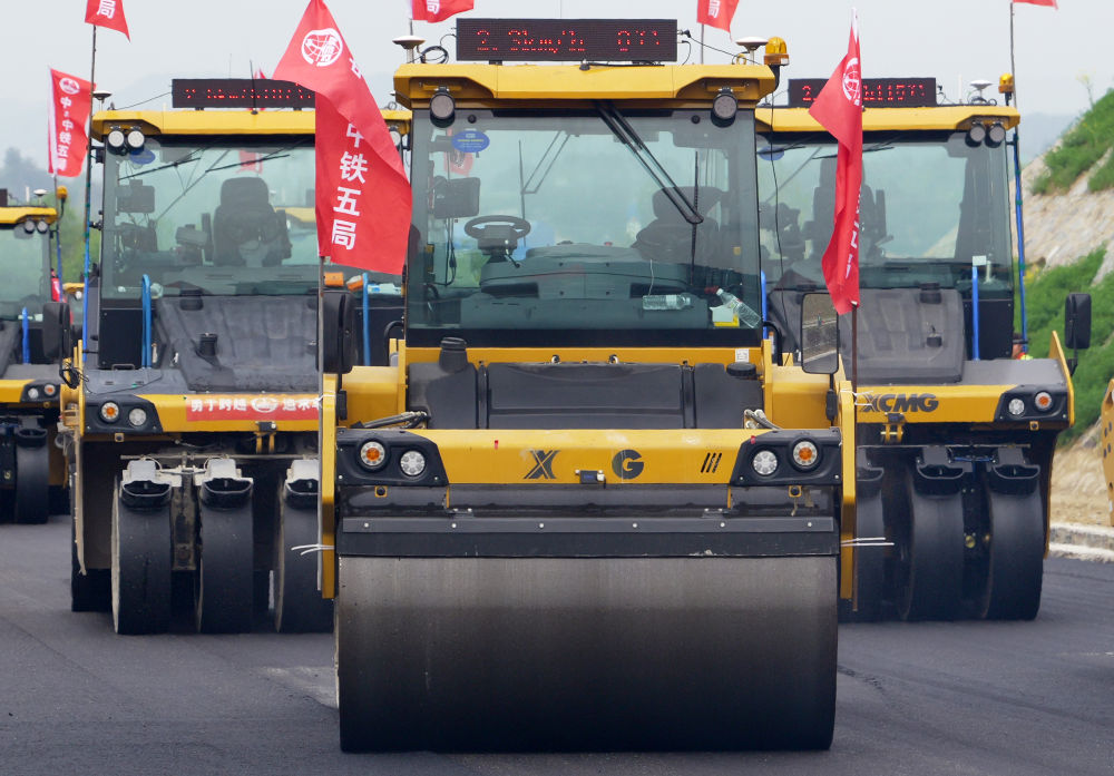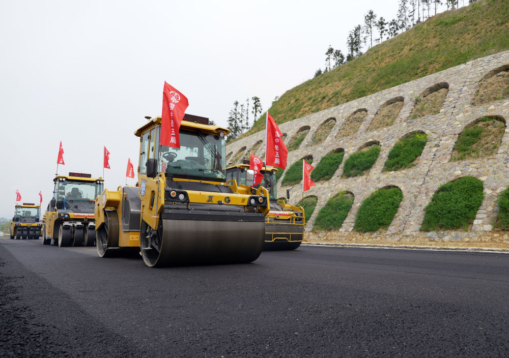 2024年4月11日,在河南省新縣,無人駕駛壓路機在由中鐵五局承建的沿大別山高速公路雞公山至商城段進行施工作業(yè)。 新華社記者 李嘉南 攝