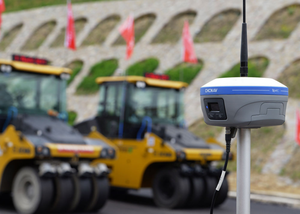 2024年4月11日,在河南新縣境內(nèi)的沿大別山高速公路雞公山至商城段,基準站在為作業(yè)中的無人駕駛壓路機提供定位坐標。 新華社記者 李嘉南 攝