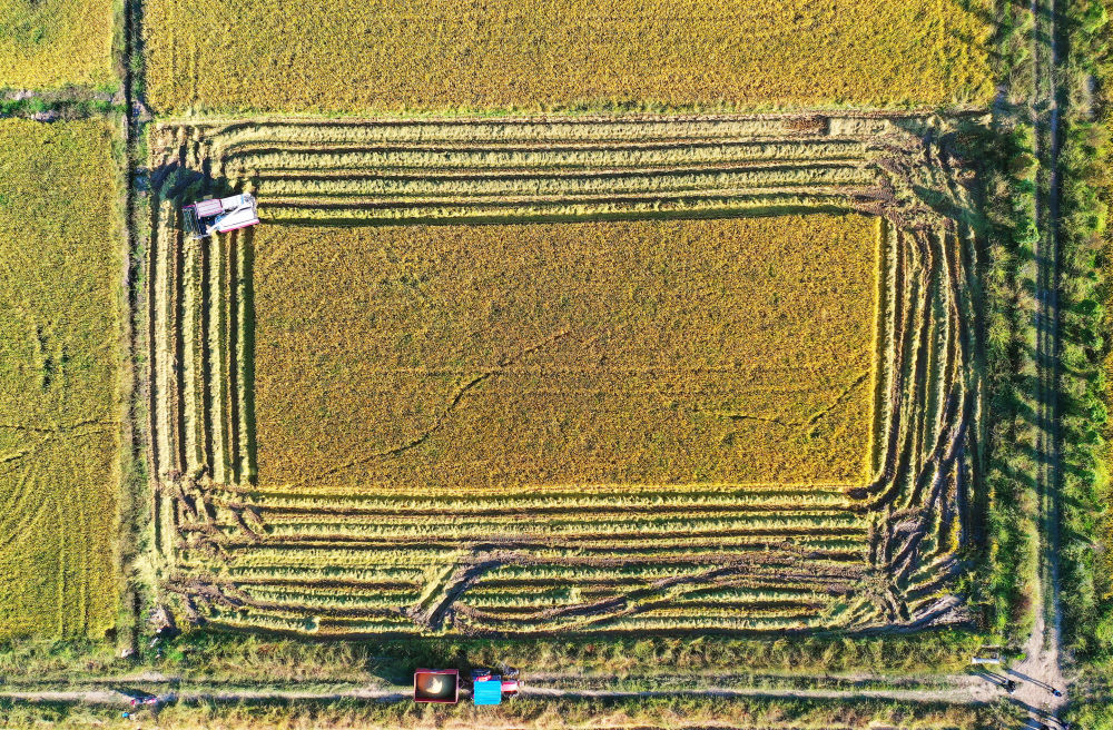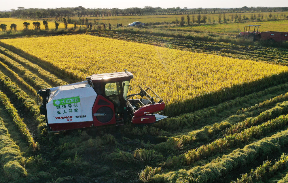 2022年10月11日,在江西省南昌縣大田農(nóng)社,無人駕駛收割機在收割成熟的水稻。無人駕駛收割機裝有精準導航系統(tǒng),提高了收獲精度,降低了糧食損耗。 新華社記者 萬象 攝