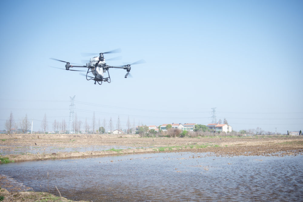 2023年3月15日,在湖北省武漢市黃陂區(qū)胡港灣村,武漢永旺農(nóng)產(chǎn)品專業(yè)合作社的植保無人機在播撒谷種。 新華社記者 伍志尊 攝