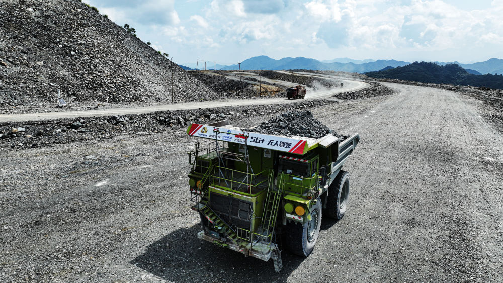 這是江銅集團德興銅礦5G智能采礦運輸作業(yè)場景(2023年8月24日攝)。電動輪汽車使用“5G+無人駕駛”技術實現(xiàn)礦山運輸生產(chǎn)裝、運、卸全流程作業(yè)過程無人自主運行。 新華社發(fā) (張偉峰 攝)