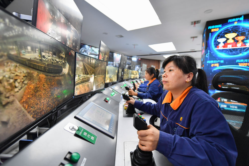 2024年6月13日,在位于湖南省湘潭市的湘潭鋼鐵集團有限公司五米寬厚板廠智慧中心,工作人員在進行遠程行車操作。五米寬厚板廠智慧中心利用超融合、虛擬化、5G傳輸以及分布式計算和存儲等技術,將五米板煉鋼、軋鋼和熱處理全工序的控制和二級、三級系統(tǒng)進行整合,改善工人的工作環(huán)境,提高生產(chǎn)的自動化程度和效率。 新華社記者 陳澤國 攝