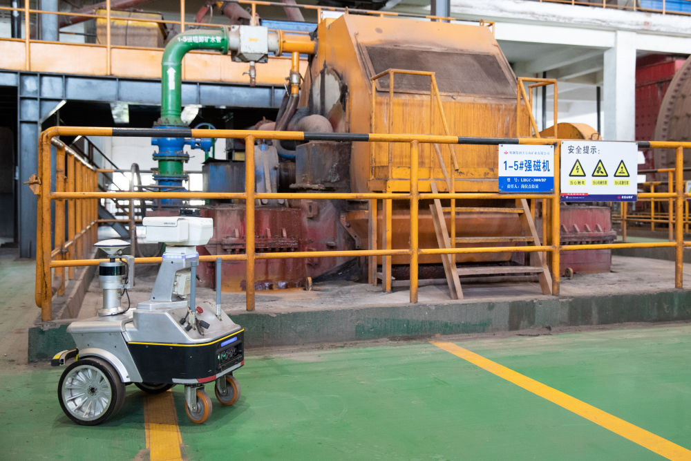 生產(chǎn)現(xiàn)場(chǎng)無(wú)人化,依靠什么來(lái)實(shí)現(xiàn)?步入磨磁車(chē)間,巨大的轟鳴聲在這個(gè)長(zhǎng)約100米、寬約50米、高約30米的廠房?jī)?nèi)回響。登上二樓作業(yè)平臺(tái),兩臺(tái)直徑6.2米的大型球磨機(jī)上的轉(zhuǎn)輪正在飛速旋轉(zhuǎn)。不遠(yuǎn)處,磨磁巡檢機(jī)器人閃爍著燈光,正在采集設(shè)備溫度、振動(dòng)等狀態(tài)數(shù)據(jù)。