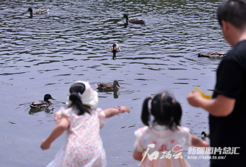 △6月15日,烏魯木齊市民在水磨溝區(qū)水磨河濱河景觀帶喂鴨子。古爾邦節(jié)假期,許多市民選擇在家門口“微度假”模式,悠享慢時(shí)光。石榴云/新疆日?qǐng)?bào)記者 秦梅花攝