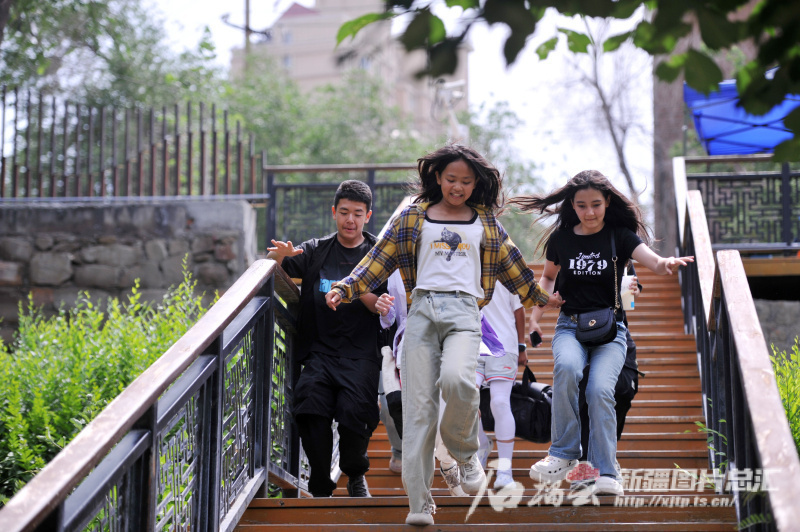 △6月15日,幾位中學(xué)生在烏魯木齊市水磨溝區(qū)水磨河濱河景觀帶玩耍。石榴云/新疆日?qǐng)?bào)記者 秦梅花攝