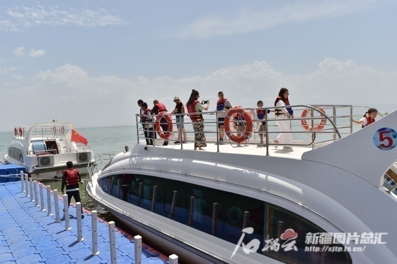△6月15日,游客在博斯騰湖景區(qū)乘坐游艇游玩。石榴云/新疆日?qǐng)?bào)記者 王立華攝
