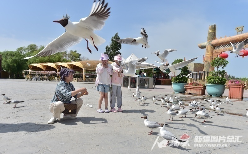 △6月15日,游客在博斯騰湖景區(qū)與海鷗互動(dòng)。石榴云/新疆日?qǐng)?bào)記者 王立華攝