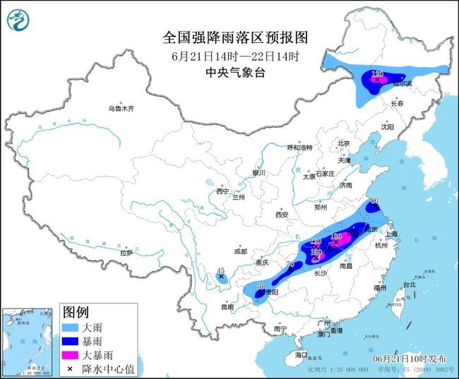 預計,6月21日14時至22日14時,貴州中南部、湖南北部、湖北東部和南部、河南東南部、江西西北部、安徽、江蘇以及內蒙古東部、黑龍江南部、吉林西北部等地部分地區(qū)有大到暴雨,其中,安徽中部、湖北東部和南部、湖南東北部、內蒙古東部、黑龍江西南部、吉林西北部等地局地有大暴雨(100~180毫米)。上述部分地區(qū)伴有短時強降水(最大小時降雨量30~50毫米,局地可超過80毫米),局地有雷暴大風等強對流天氣。