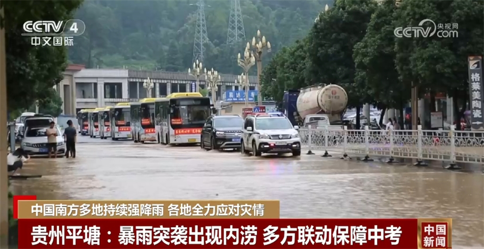受強降雨的影響,23日,貴州平塘縣低洼路段出現內澇。恰逢當地中考最后一天,為保障學生順利參考,平塘縣第一時間啟動應急預案,引導接送考生車輛安全行駛。