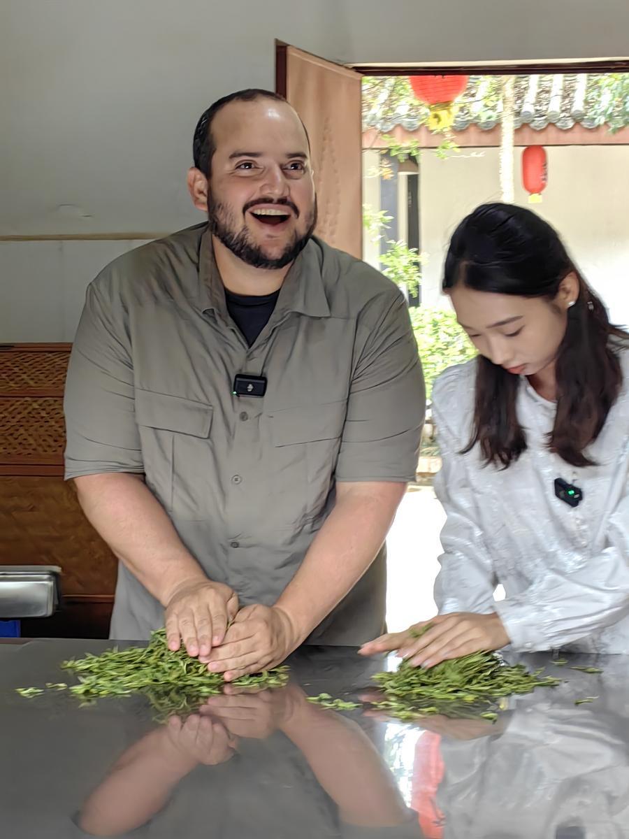 5月29日,新華社古巴籍記者塞爾希奧·戈麥斯(左)在云南省普洱市思茅區(qū)體驗(yàn)制茶。新華社記者 李曄 攝