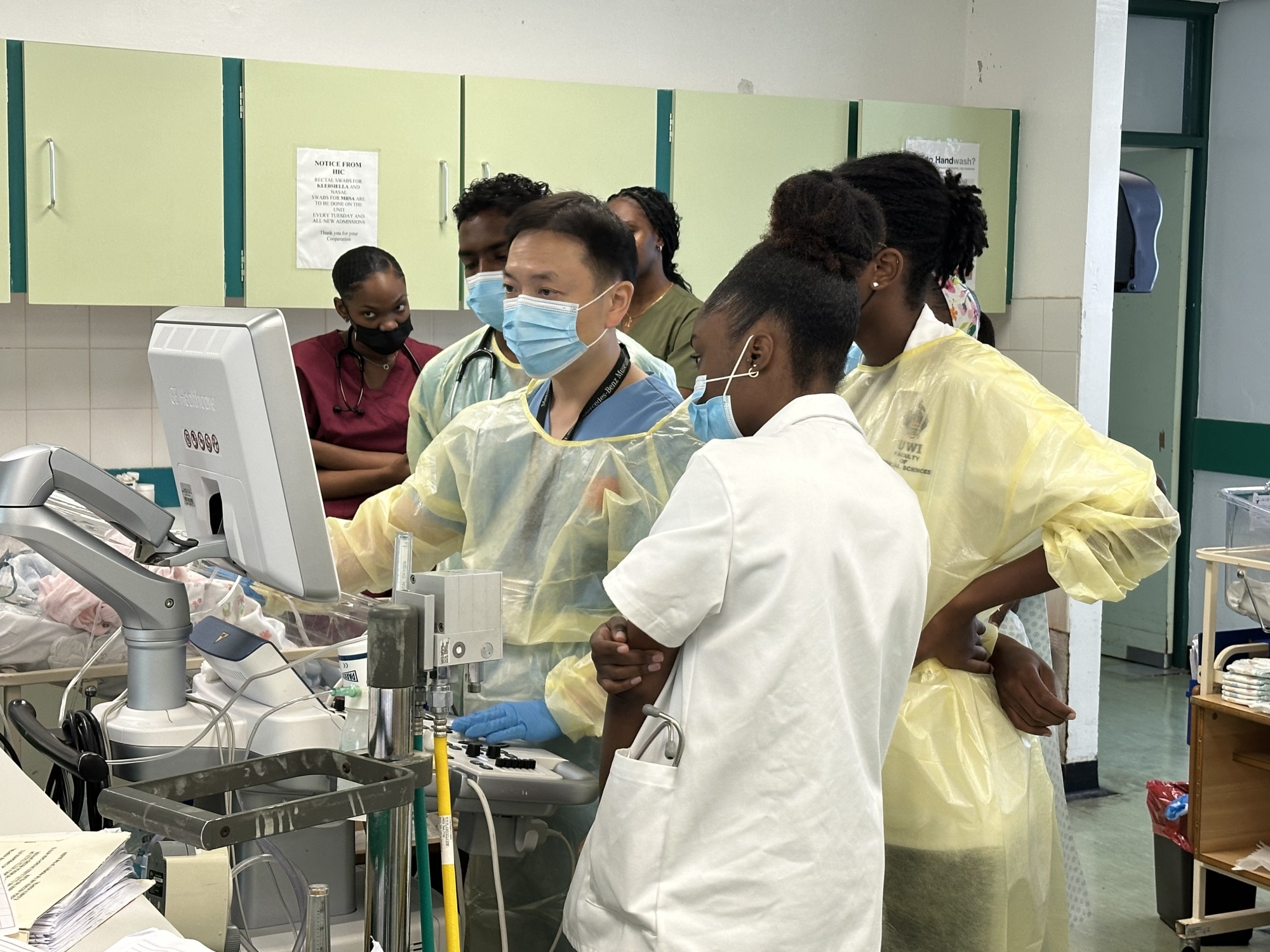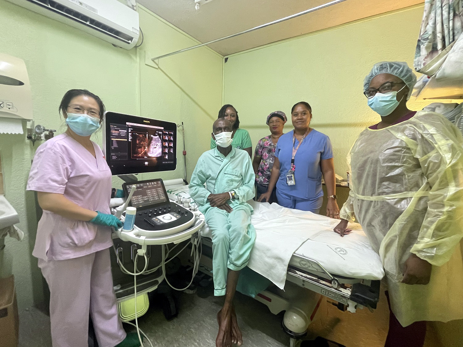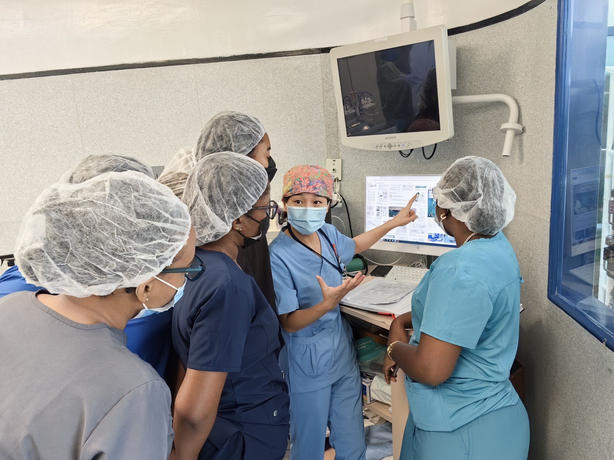 劉麗萍(左一)開展巴巴多斯第一例超聲造影技術