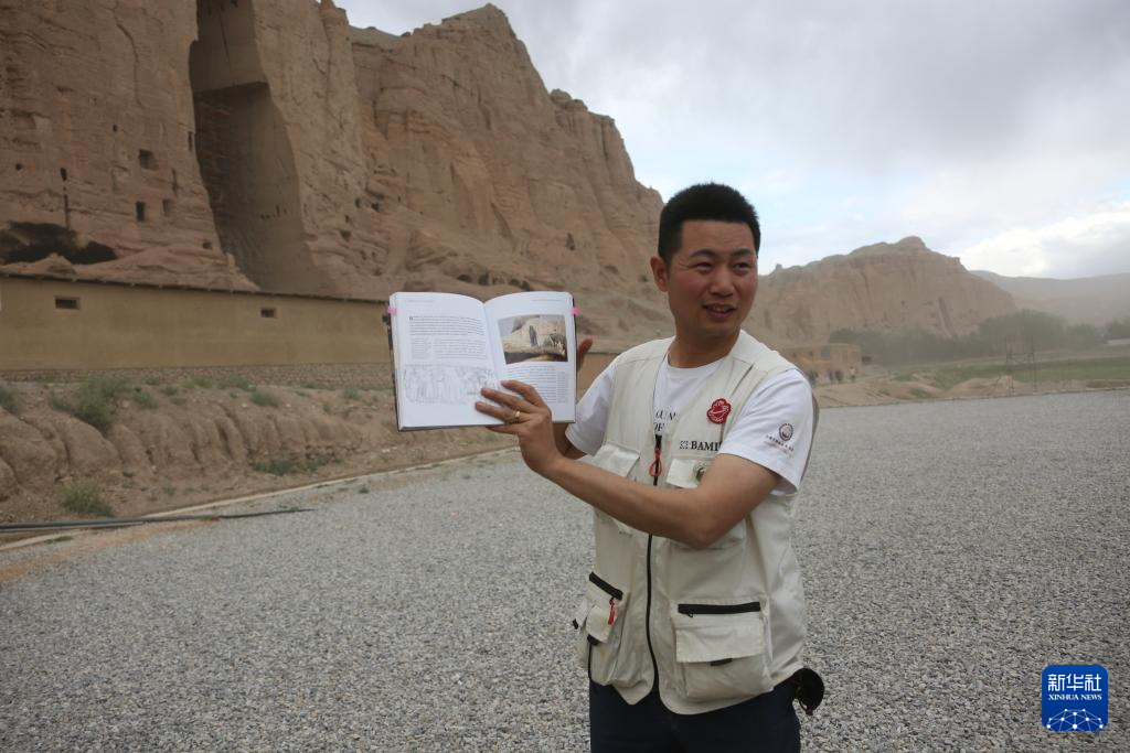 6月15日,在阿富汗巴米揚省的巴米揚大佛遺址區(qū),中國學者邵學成展示書中記載的巴米揚大佛相關(guān)內(nèi)容。新華社發(fā)(塞夫拉赫曼·薩菲攝)
